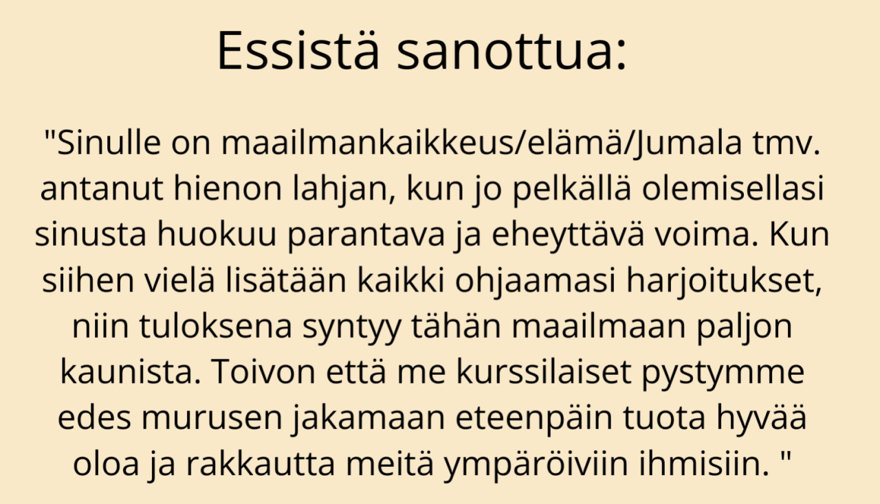 "Paljon pohdittavaa ja sisäistettävää asiaa tuli päivistä! Ja ihania kohtaamisia. Vedät tosi ammattitaidolla ryhmää ja ohjausta! olet ihan super ja oikeassa työssä"