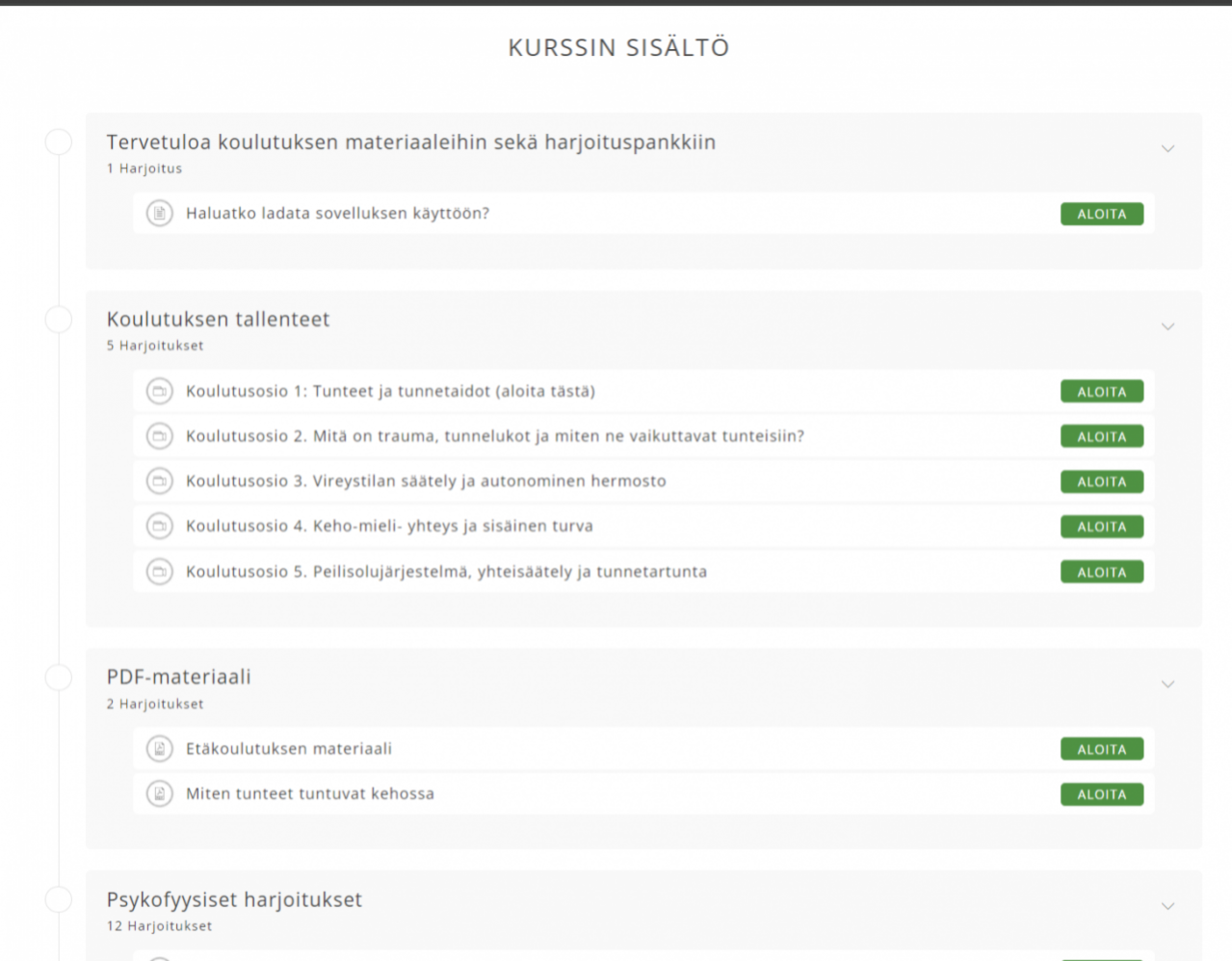 Koulutuksen verkkoalustalta löydät teoriat selkeinä tallenteina, PDF-materiaalin teorioista sekä erilaisia psykofyysisiä harjoituksia videotallenteina. Koulutuksen verkkoalustalle pääset heti ilmoittautumisen jälkeen ja voit aloittaa teorioiden katsomisen saman tien.